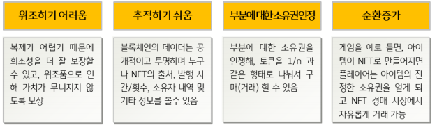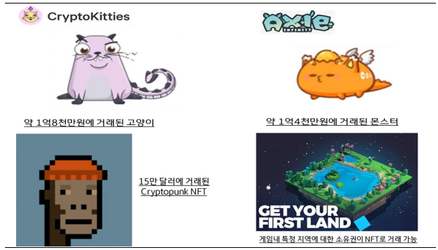 NFT는 거의 모든 것을 토큰화할 수 있으며, 블록체인 기술에 의해 디지털 소유권이 보장되고 비가역적 거래 증명이 가능하기 때문에 현재 ∆게임 아이템 ∆실물 자산 ∆예술품 ∆사치품 ∆수집품의 토큰화에 주로 활용