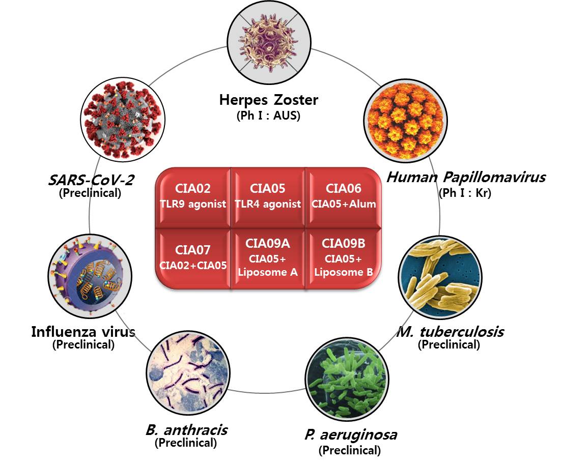 당사는 2014년 11월부터 국가과제(사업부처: 한국보건산업진흥원/사업명:감염병위기대응기술개발)에 선정되어 과제명 '고효율 대상포진 백신 개발' 사업을 수행하고 있습니다. 재조합단백질 생산기술을 바탕으로 대상포진 항원 (외막단백질)개발에 착수하여 대상포진 항원 생산을 위한 공정 확립 및 품질시험법을 구축 및 확립하였으며 현재는 호주 현지에서 '대상포진 백신 EG-HZ' 임상 1상 투약 및 관찰의 전 과정을 완료하였고 임상 최종보고서 작성을 진행 중입니다.