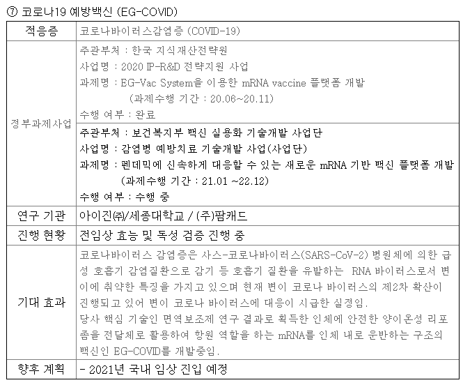 핫이슈인 코로나19 예방 백신 (EG-COVID)은 추가 전임상(동물시험)을 마치고, 임상 샘플 완료하는 대로 임상 단계 진입 계획이다. 앞서 나온 기사에는 2분기에 임상 시작할 것이라고 하니, 조만간 임상 시작할 것으로 생각된다.