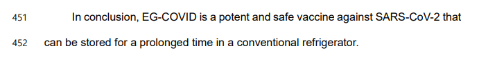 결론적으로 EG-COVID는 기존의 냉장고에 장기간 보관할 수있는 SARS-CoV-2에 대한 강력하고 안전한 백신이다.