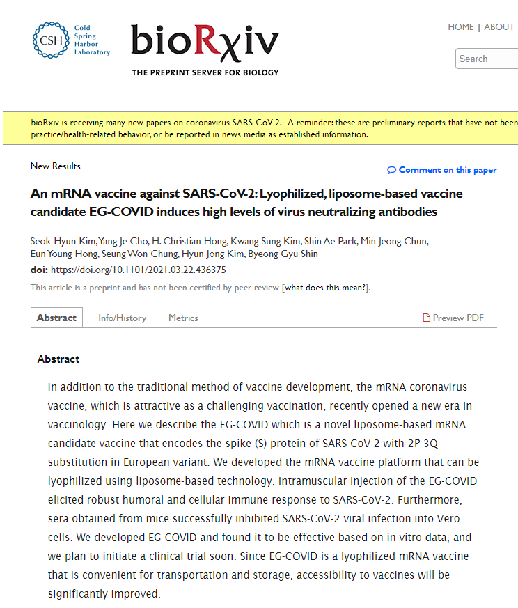 아이진은 개발 중인 코로나 19 예방백신(EG-COVID)의 비임상 연구 논문이 콜드스프링하버 연구소의 바이오리시브(BioRxiv)에 게재됐다고 기사가 나왔다.