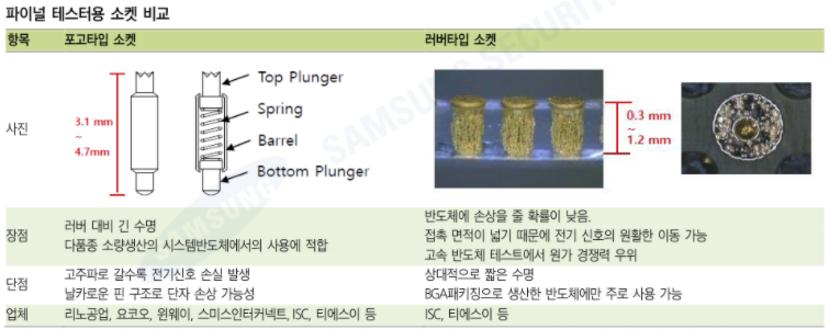 실리콘러버타입 소켓은 메모리에서 사용이 시작되었으며, 메모리는 대부분 실리콘러버타입 소켓이 파이널테스터에 들어가고 있음.