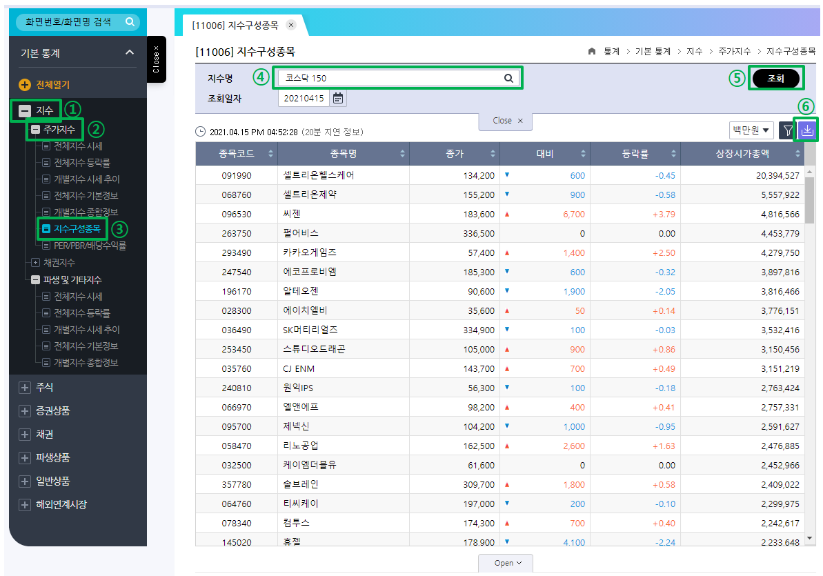 ⑥ 종목 리스트를 다운로드 받고 싶으면, 클릭 (파일 형식은 xlsx, CSV 두 개 중 선택 가능)