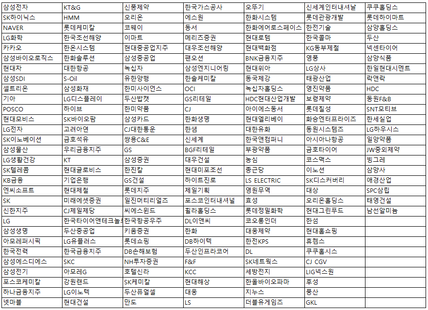 그래서 코스피200, 코스닥150 지수에 편입된 종목들을 살펴 보려고 한다.