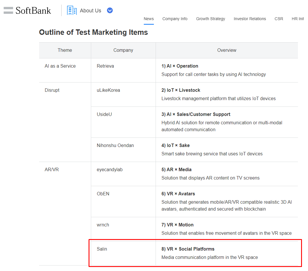 2018년 소프트뱅크 이노베이션 프로그램에 아래와 같이 살린을 찾을 수 있었다.