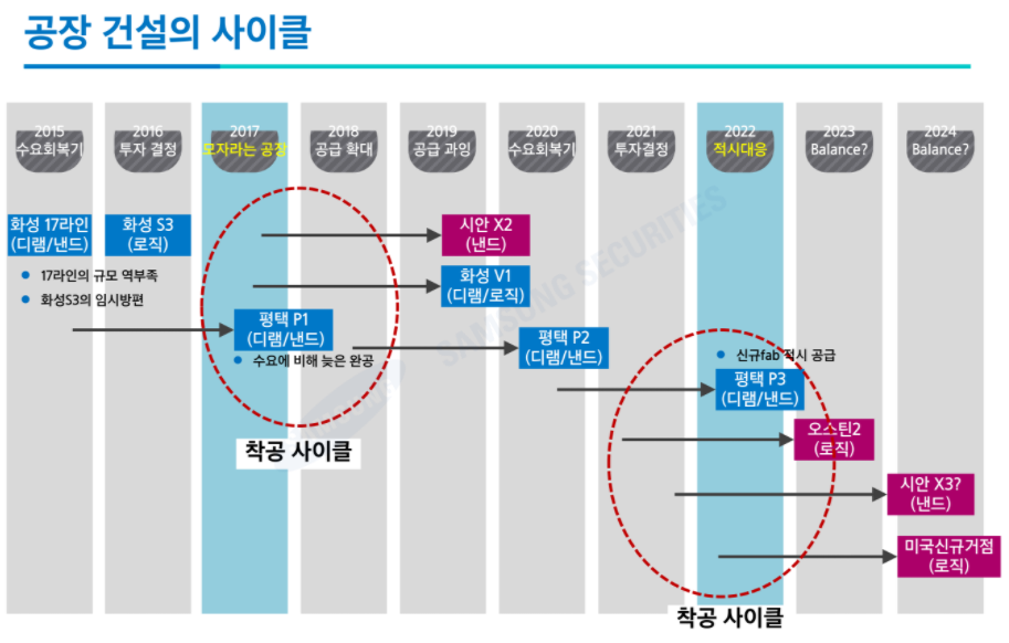 아래 공정 건설 사이클을 보면, 평택P3, 오스틴2, 시안X3(?), 미국신규거점까지 총 4개 공장의 신설 계획이 표현되어 있는 것을 볼 수 있다.
