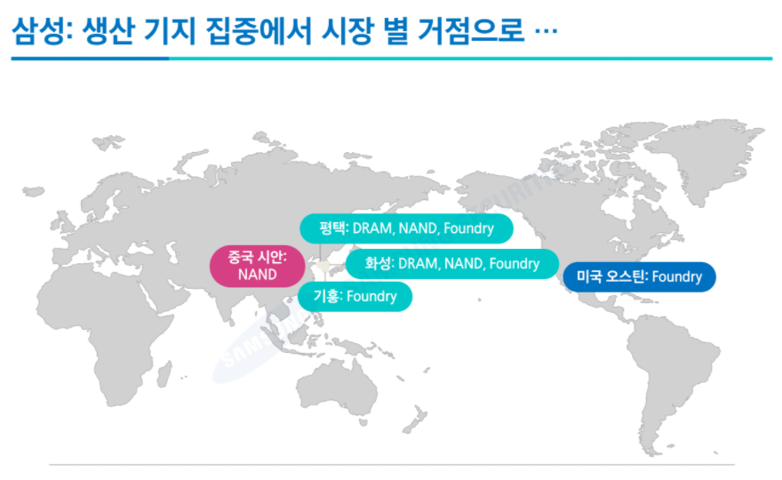 현재 중국에는 낸드플래시 생산이 가능한 시안 공장 1개가 있고, 미국에는 오스틴에 파운드리 공장(14~65nm)이 1개가 있다.