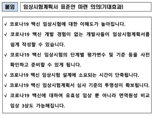 식품의약품안전처는 ▲ 임상 1·2상 ▲ 일반적인 유효성 임상 3상 ▲ 비교 임상 3상 등 코로나19 백신 임상시험계획서 표준안 3종을 제공한다고 발표했다.