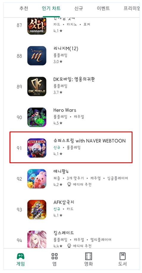 현재 슈퍼스트링 게임이 지난 5/25 일자에 출시가 되었으며, 오늘 (6/10) 안드로이드 플랫폼 플레이스토어에 매출 순위 91로 자리매김하고 있다.