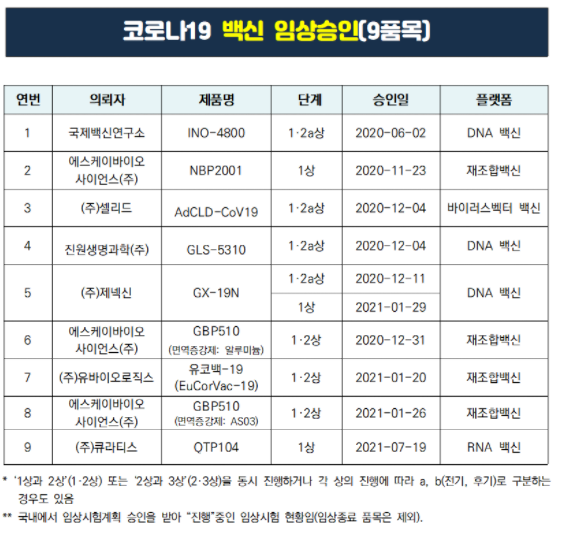 그리하여 국내에서 코로나19 예방색신 임상 승인 품목은 1개가 더 늘어서, 현재 총 9개가 되었다.
