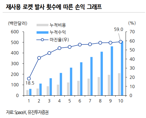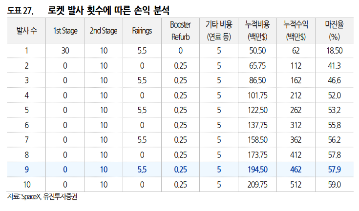 아래 표를 보면 발사 횟수에 따른 누적 수익이 비례해서 늘어나고, 1 단 로켓과 페어링 회수를 통한 비용 절감을 통해 마진율 또한 크게 상승한 것을 볼 수 있다. 현재까지 로켓이 재사용된 최대 횟수는 9 회인데, 올해 3 월 14 일 발사로 갱신한 기록이다. 9 회째 발사된 로켓의 마진율은 57.9%로 첫 발사의 마진율 18.5%의 3 배가 넘는 수치다.