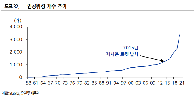 우리는 재사용 로켓으로 낮아진 우주산업 장벽의 가장 큰 수혜를 받는 인공위성 사업에 주목해야 한다. 그 중에서도 수 많은 통신위성을 지구 저궤도에 올려 글로벌 초고속 인터넷망을 구축하는 저궤도 통신위성 그리고 위성영상의 활용도가 높아진 관측위성 시장의 성장을 전망한다.