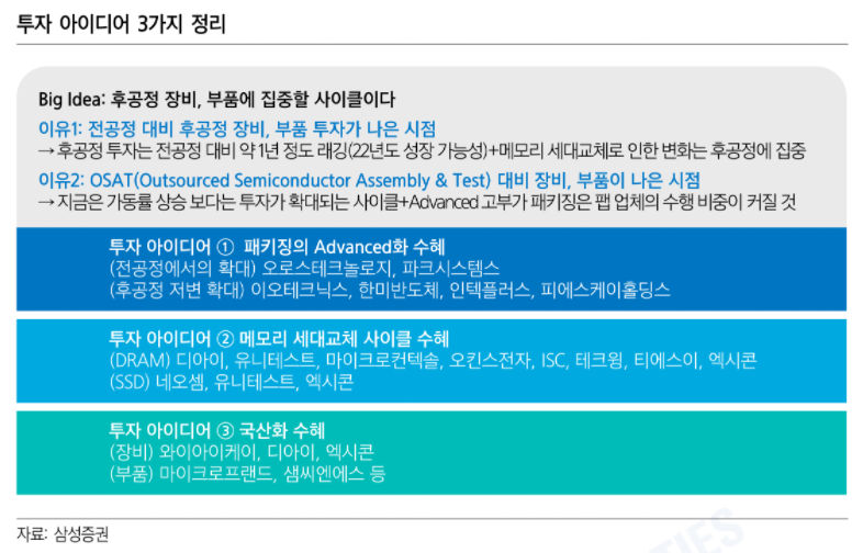 후공정의 지위상승 및 중요도 상승 속 후공정 Capex가 구조적으로 상승하는 모습이다. 따라서 현 시점은 후공정 장비, 부품에 주목할 필요가 있다고 판단한다. 특히나 투자 아이디어로서 1) Advanced 패키징 고성장 속 해당 공정에 기여 가능한 업체, 2) 메모리 세대 변화 속 P와 Q 증가가 나타날 후공정 업체, 3) 국산화를 바탕으로 M/S 상승 속 새로운 어플리케이션이나 타 고객사로 확대되는 업체에 주목할 것을 제시한다.