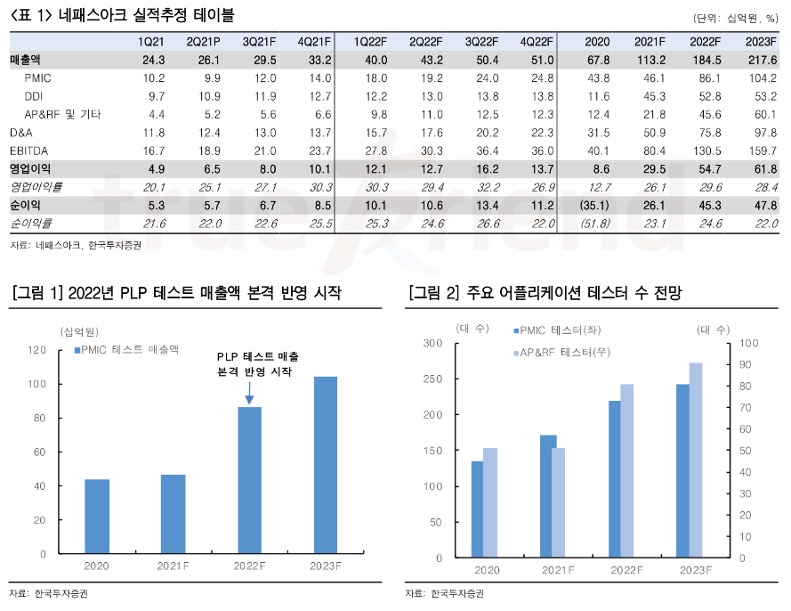 - PLP 3K(round 기준 15K)를 대응할 수 있는 테스터를 4분기 초까지 셋업 완료. 지금까지 셋업된 테스터 기준 내년 PLP 테스트 매출 약 250억~300억원 가능, 향후 네패스 라웨 PLP 패키징 증설 일정에 맞춰 추가 테스터 반입 결정될 것