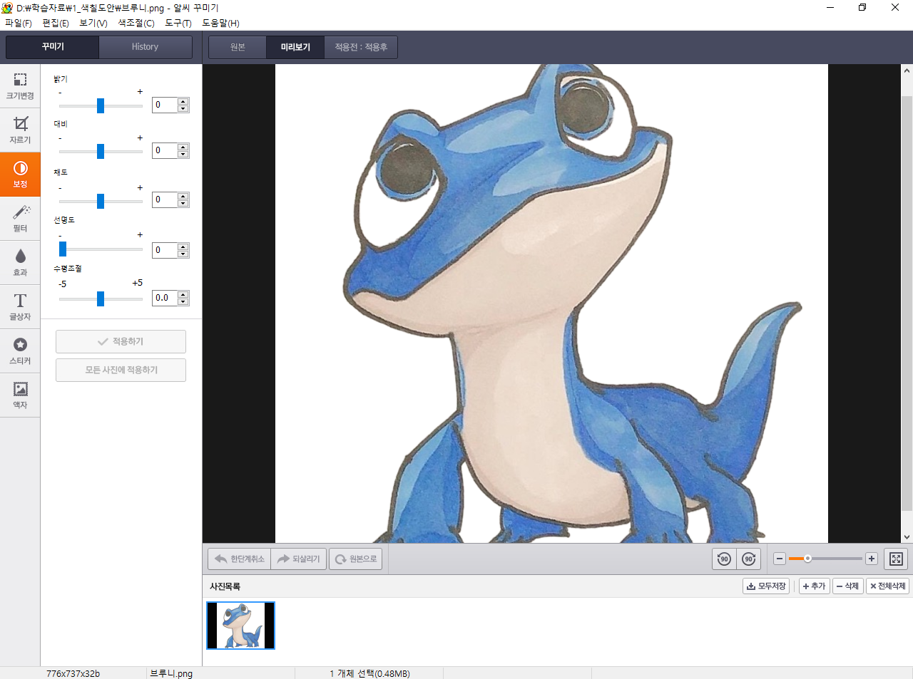 브루니의 색깔을 옅게 바꾸던가 색을 없애야, 색칠 도안으로 활용할 수가 있는데, 그림판에서는 추가 작업을 할만한 것이 없어서 알씨에서 위에서 저장한 그림을 불러왔다.