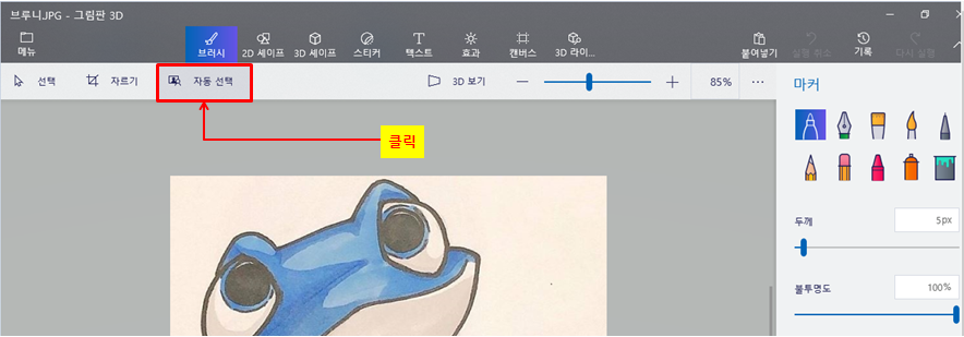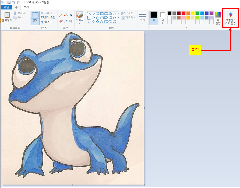 일반 그림판에서 브루니 그림을 띄우면, 우측 상단에 "그림판 3D로 편집"이라는 아이콘이 보인다. 이것을 클릭!