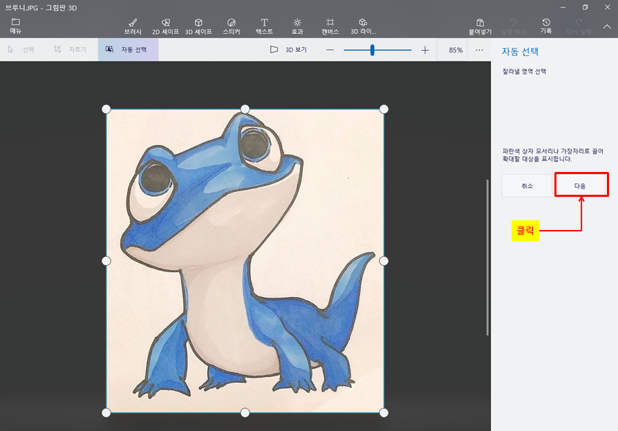 1. 브루니 그림을 그림판 3D으로 불러와서, 배경은 삭제하기