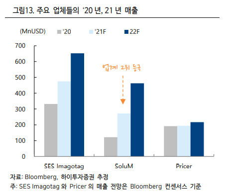 SES Imagotag, Pricer, 솔루엠 등 상위 3 사가 시장의 80%를 점유하는 과점 시장이다. 즉, 성장의 과실을 소수 업체가 나누어 먹는 구조다. 솔루엠은 ‘20 년 기준 점유율 16%의 3 위 업체이나, 올해 Pricer 를 제치고 2 위로 등극할 전망이다