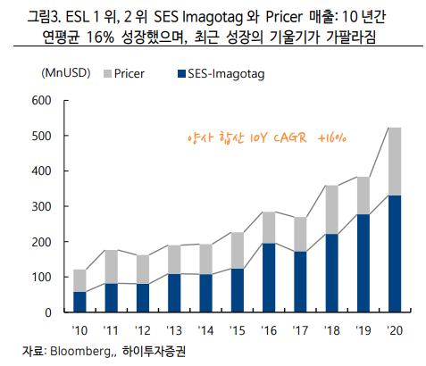 지난 10 년 간 ESL 시장 1, 2 위 업체인 SES Imagotag 와 Pricer 의 합산 연평균 매출 성장률은 +16%다. 특히 ‘20 년 이후 성장의 기울기가 더 가팔라졌다. 코로나 19 이후 유통망의 Automation 이 부각 받고 있기 때문이다.