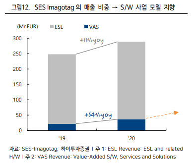 업계 1 위인 SES-Imagotag 의 경우 ‘20 년 기준 전사 매출의 13%가 이 같은 S/W 매출이다. S/W 매출은 Device 보다 GPM 이 상당히 높기 때문에 S/W 비중이 커질수록 전사 마진 믹스가 개선되는 구조다.