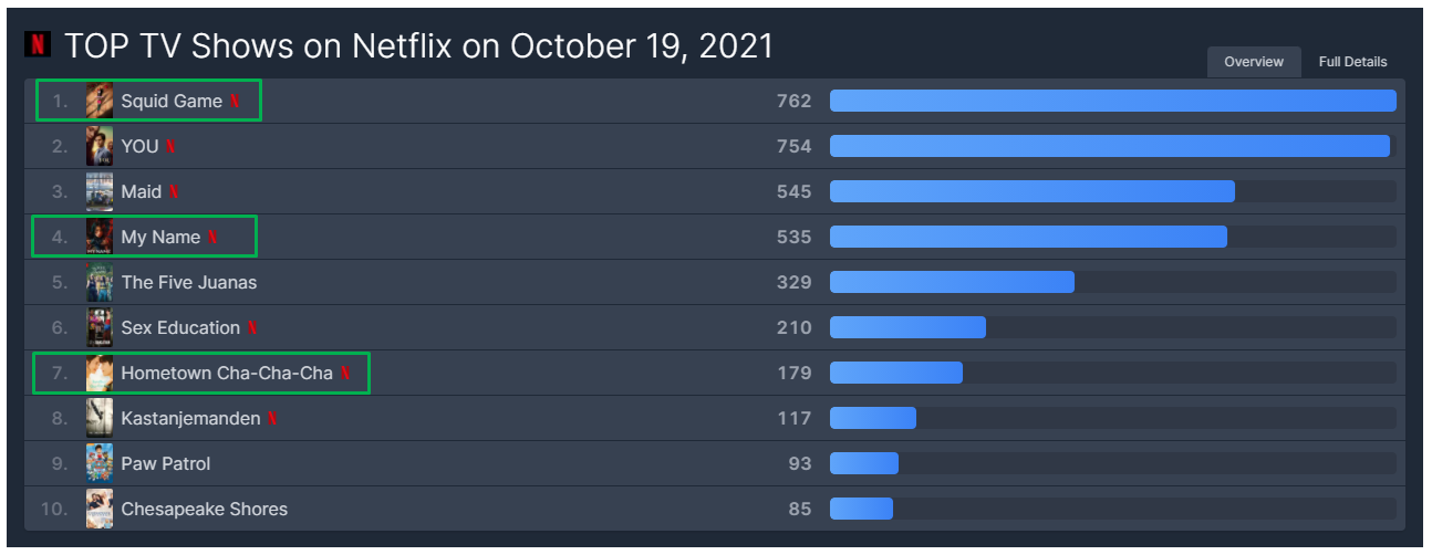 그래도 글로벌리하게 4위에 랭크될 정도로 어필하는 요소가 있는 것은 분명하고, 한국드라마가 1, 4, 7위에 있는 것을 보니, 새삼 한국 컨텐츠의 위상이 이 정도구나 싶다.
