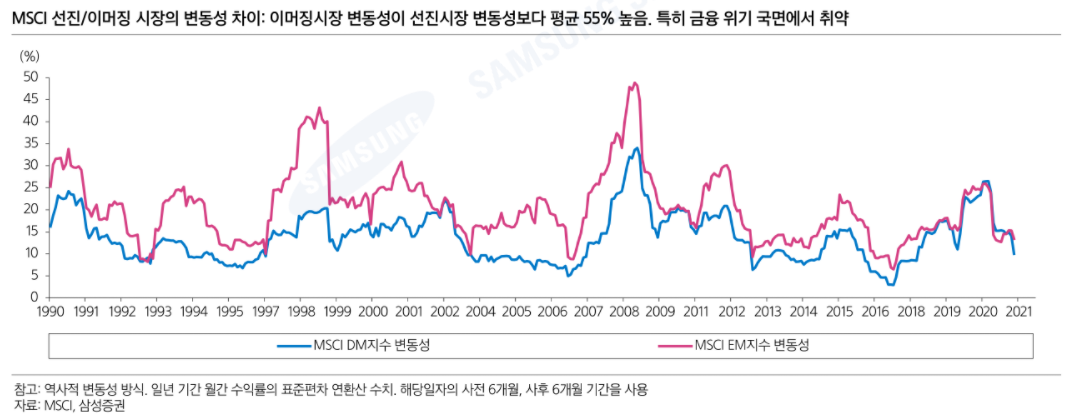 ▶ 역사적으로 MSCI EM의 변동성이 MSCI DM의 변동성보다 평균 55% 가량 높음. 즉, 시장 불안정성이 높았음