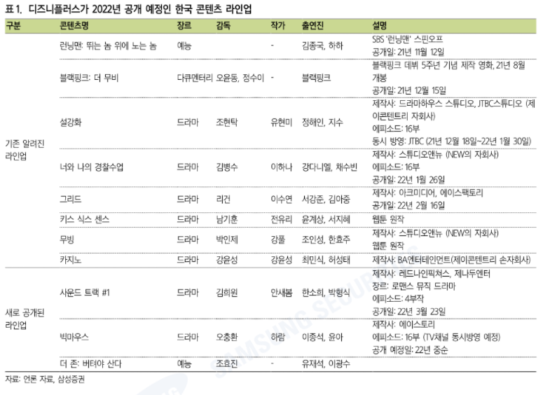 1) 디즈니플러스가 금년 공개될 한국 오리지널 작품을 추가 공개하며 연간 공개할 한국 콘텐츠 목표치를 제시