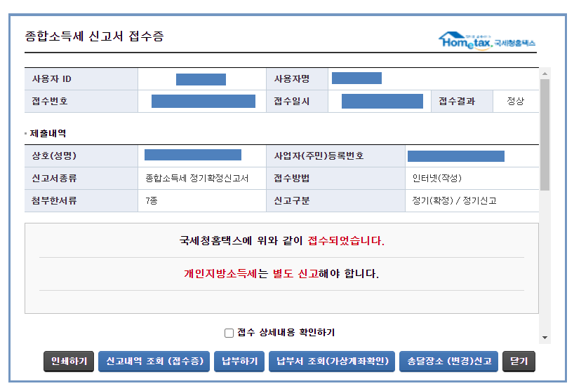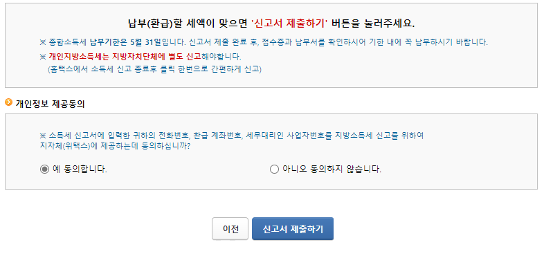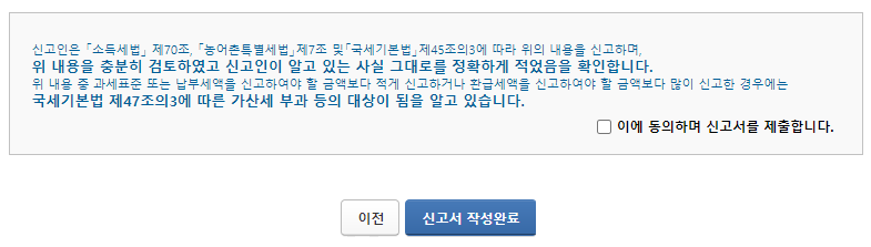 특이한 내용은 없으므로 신고서 제출하기 완료.
