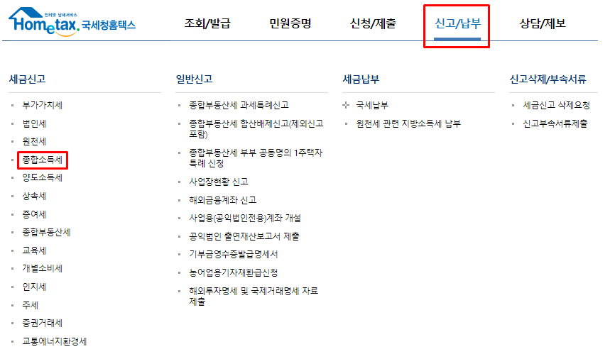 1. 홈택스 메인에서 신고/납부를 열어서, 종합소득세를 클릭한다.