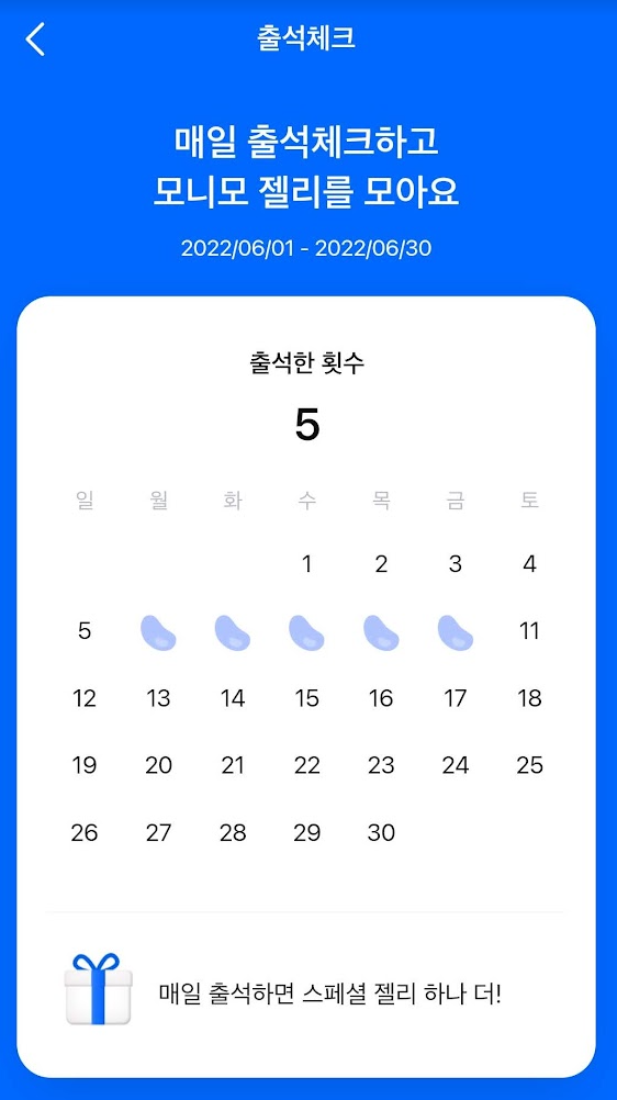 출석체크는 아래 그림처럼 매일 출석 도장 찍으면, 파랑 젤리를 1개씩 준다.