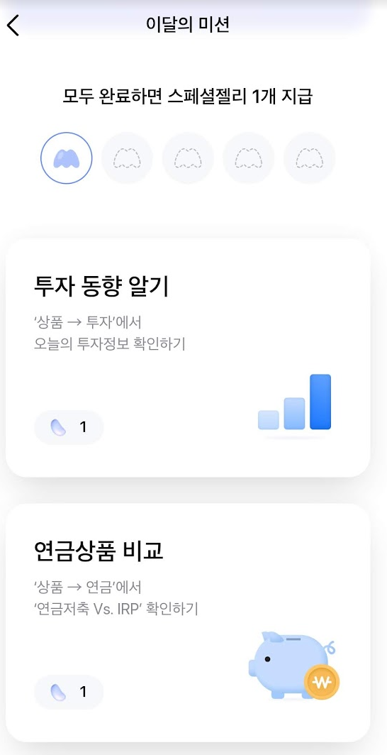 아래와 같이 5개의 미션이 있고, 1개씩 완료할 때마다 '젤리'를 1개씩 준다.