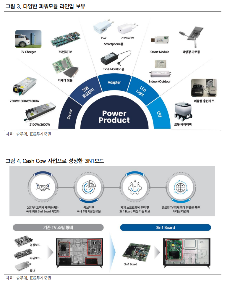 파워모듈은 동사 매출의 28%를 차지하고 있으며 15W ~ 3,000W까지 다양한 라인업 을 보유. 현재까지 TV 전원공급장치, 스마트폰/TV Adapter, Server 등에 적용되어 왔으며, 향후 국내 EV 충전용 파워모듈 시장까지 진출할 계획 3IN1보드는 영상보드, 파워보드, 튜너 및 소프트웨어가 1개의 보드로 통합된 제품으로 2017년부터 국내 S사 TV에 적용 중. 3IN1보드 채택 시 원가절감 효과 존재, 3IN1보드 채택률은 매년 높아지는 중으로 현재 29% 수준으로 추정. 고객사 내 점유율은 90% 수준으로 향후 S사 채택률 확대와 중국 로컬 업체 등 고객사 다변화가 동 사업부 매 출 성장을 견인할 것으로 판단