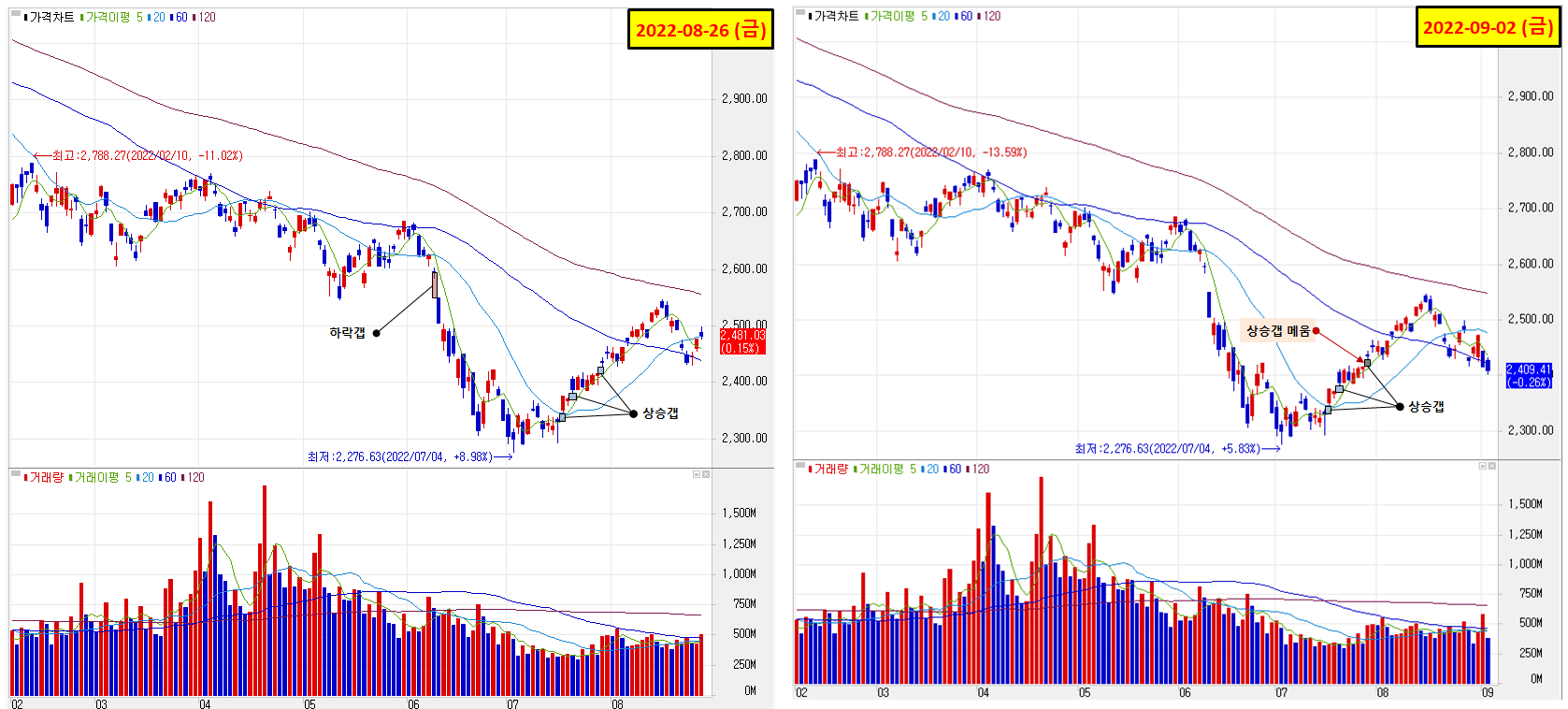 | 2022년 9월 7일,,,상승갭 2개째 메우기 완료 (0) | 2022.09.07 |