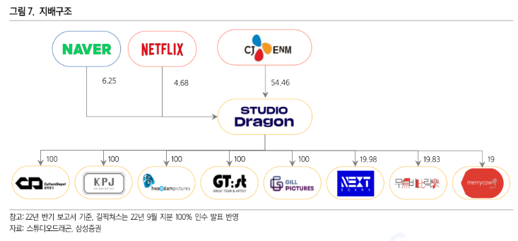 최근 스튜디오드래곤은 제작사 '길픽쳐스' 지분 100%를 인수했다. 길픽쳐스는 SBS 드라마 '스토브리그', '원더우먼'을 비롯해 금년 초 스튜디오드래곤과 협업해 제작했던 '소년심판'을 만든 바 있고 10여 명의 작가가 소속되어 있다. 이번 인수로 스튜디오드래곤은 화앤담픽쳐스, 문화창고, KPJ, 지티스트, 길픽쳐스 5개의 100% 자회사를 보유하고, 무비락 메리카우, 넥스트씬 3개 제작사의 지분을 보유하게 됐다.