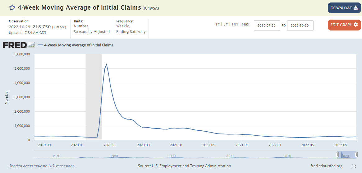 많은 경제 전문가들이 내년 상반기 말부터 경기 하락을 언급하는데, 미국 신규 실업수당 청구건수 (4주 평균) 차트를 꾸준히 모니터링하면서 경제를 지켜보면 많은 것을 배울 수 있을 것 같다.