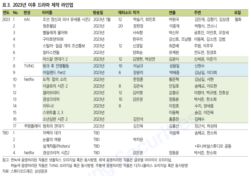 OTT 오리지널 콘텐츠로는 애플TV+ '더 빅도어 프라이즈(3부)', 넷플릭스 '더 글로리(8부)', 티빙/아마존 프라임 '아일랜드'가 동시 방영 작품으로는 '슈룹', ;연예인 매니저로 살아남기', '환혼: Part2' 등이 4분기 실적에 반영될 것이다.