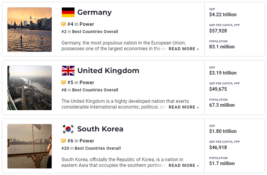 Power 부문 순위는 한 국가의 Power(영향력)과 관련된 5가지 국가 속성(지도자, 경제적 영향력, 정치적 영향력, 강력한 국제 동맹 및 강력한 군사력)의 균등 가중 평균 점수를 기반으로 합니다.