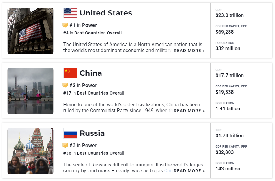 The Power subranking is based on an equally weighted average of scores from five country attributes that relate to a country's power: a leader, economically influential, politically influential, strong international alliances and strong military. For more information on how we rank, read the Best Countries methodology.
