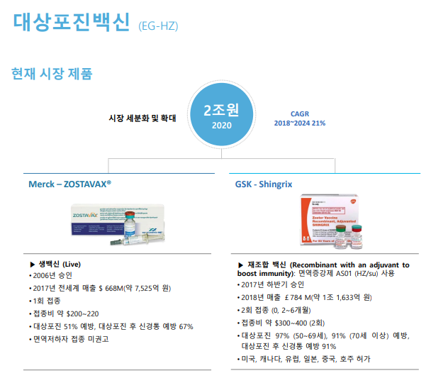 국내 대상포진 예방백신 시장은 현재 연간 1000억원 규모지만 향후 대상포진 예방백신이 국내에서 국가백신프로그램의 ‘권장접종백신’에서 ‘무료예방 접종백신’으로 채택될 경우, 국내 시장 규모는 연간 5000억원으로 확대될 것으로 전망된다고 한다.