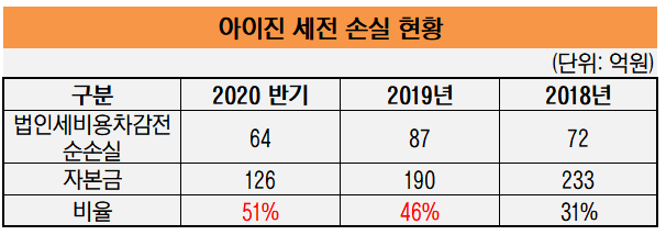 아이진은 2015년 기술특례제도로 코스닥에 상장하고 2018년부터 자본금 관련 유예기간이 종료됐다. 자기자본 대비 법차손 비율이 50%를 넘으면 관리종목 지정이 될 수 있는데, 작년 반기 기준으로 50%를 초과한 상태였다.