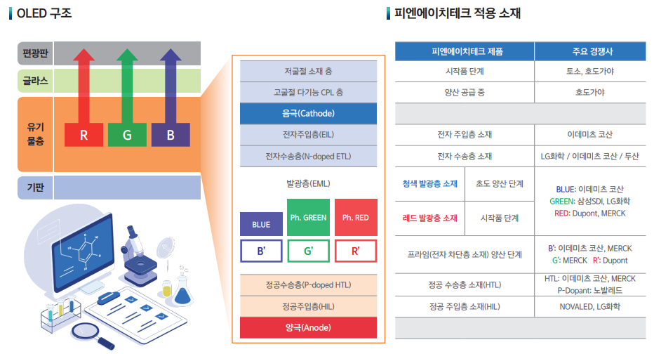 그리고 OLED 중에서 아래 그림과 같이 '유기물층'의 포함되는 소재를 집중적으로 개발하는 것으로 보인다.