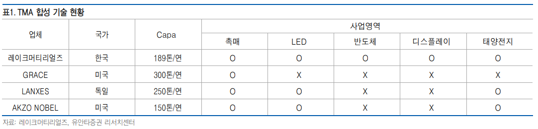 TMA는 다양한 전구체의 원재료가 되는 소재로 확장성이 좋으나, 합성 난이도가 높아 동사를 포함해 전세계적으로 4개 업 체만 제조 가능한 것으로 파악되고 있는데, 레이크머티리얼즈가 TMA 합성기술을 보유한 국내 유일의 업체이다.