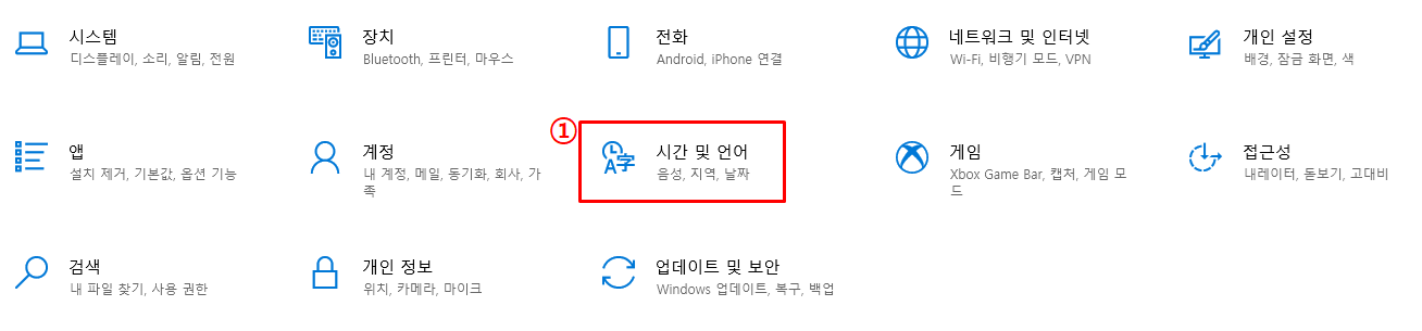 1. 윈도우 환경에서 아래의 시간 및 언어를 클릭한다.