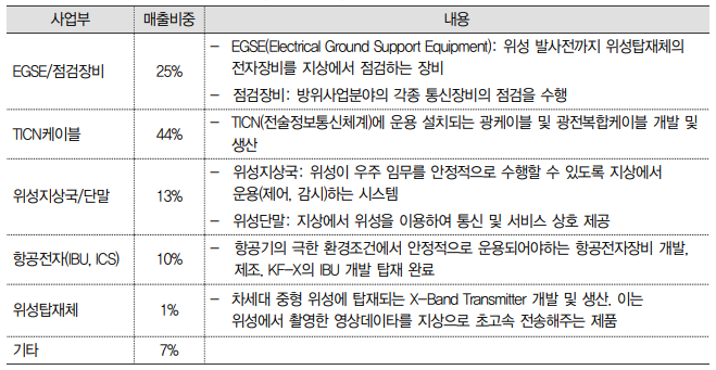 위성탑재체, 위성운 용국 및 단말, 전기지상지원장비(EGSE) 사업을 주력으로 영위하고 있으며, 주요 고객 은 한국항공우주연구원과 AIRBUS D&S이다. 국가 우주개발사업에 참여하여 X-Band Transmitter(주파수 X대역 송신기) 국산화에 성공하였으며, 군위성통신체계-Ⅱ (ANASIS-Ⅱ) 위성의 자세 및 중계기를 관리하는 위성운용국을 설계, 구축 및 제조해 오고 있다.