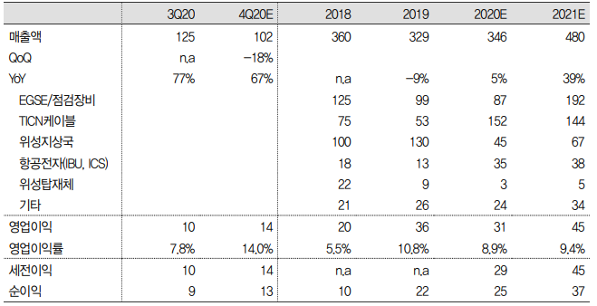 비접촉식광전케이블, 소형무장헬기(LAH) 사업 및 대한민국 차세대 전투기(KF-X) 사업 등의 항공전자장비, 점검장비 등을 영위하고 있으며, 주요 고객은 한화시스템과 한국항공우주산업이다. 3Q20 누적 기준 사업부별 매출 구성은 TICN케이블 44%, EGSE/점검장비 25%, 위성지상국/탑재체 14%, 항공 전자 10%, 기타 7%로 나뉜다.